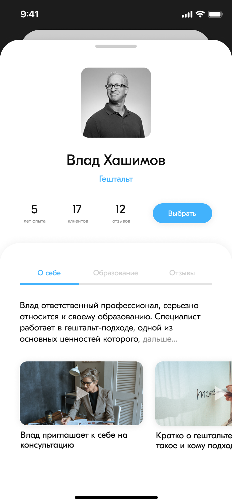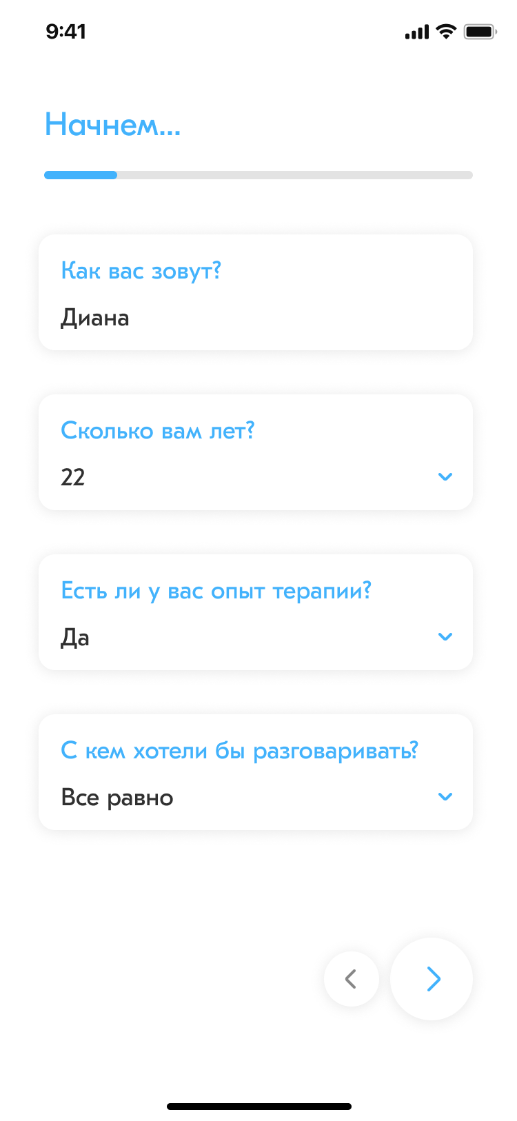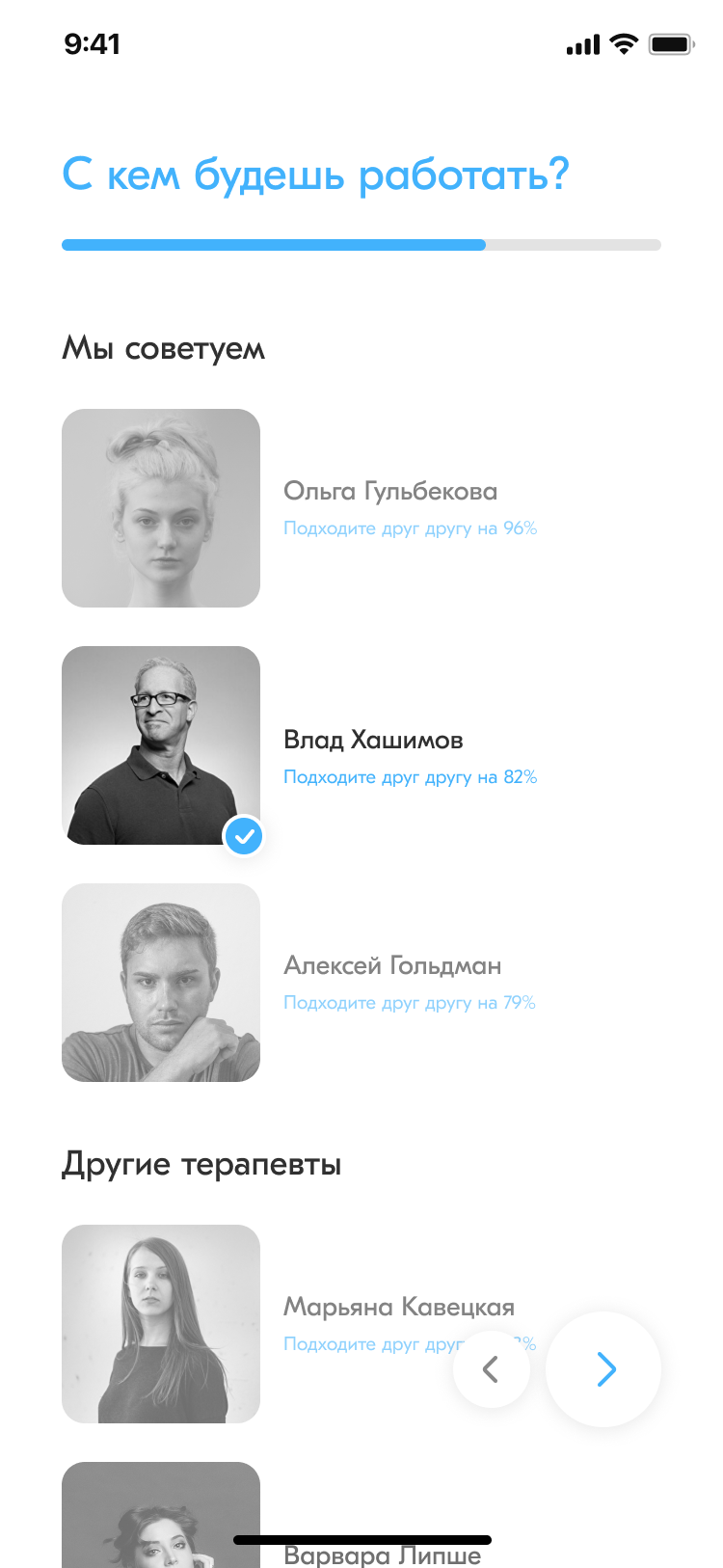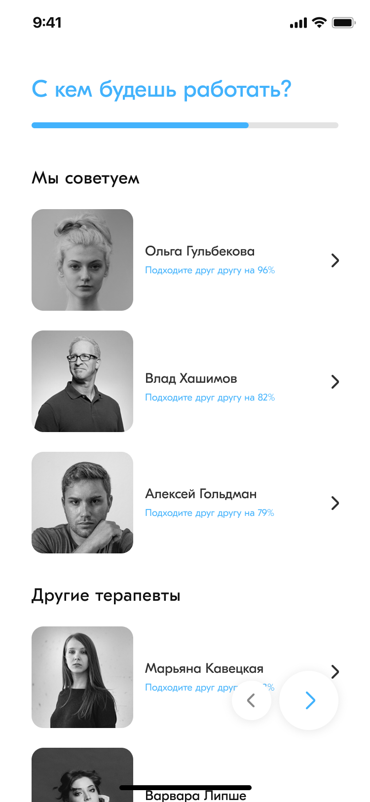 Algorithm provides you with 3-4 suggested therapists according to your answers, you can open the therapist card to browse for description, experience, education, reviews and many more