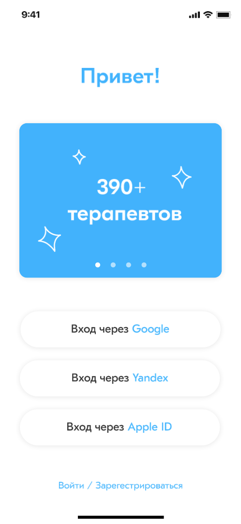 In order to start your therapy, it is necessary to sign in via Google, Yandex, Apple ID, or simply register